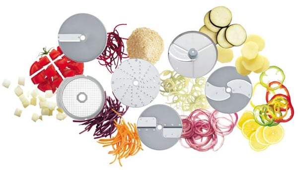 Комплект для нарізки різних видів інгредієнтів. Призначені для подрібнення різними способами овочів, фруктів, твердих сирів та інших продуктів для приготування широкого асортименту страв. Комплект із 7 дисків використовується спільно з овочерізками CL50, CL52, CL55, CL60 та кухонними процесорами R502, R652 на підприємствах громадського харчування та торгівлі. Виготовлені з нержавіючої сталі.