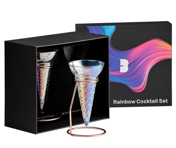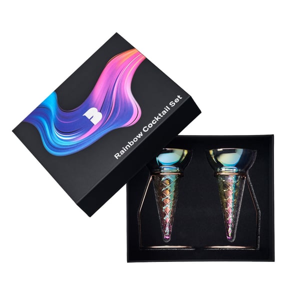 Комплект з двох келихів RAINBOW ICE CREAM ємністю по 150 мл - це витончені келихи на оригінальній підставці, які вирізняються універсальністю та можуть використовуватися для оригінальної подачі коктейлів чи інших алкогольних/безалкогольних напоїв, а також десертів. Форма цих келихів ідеальна для того, щоб запропонувати гостям оригінальну сучасну подачу за допомогою інноваційного коктейльного набору Flavour Blaster Cocktail Pro 2.5 NEW, який сповнить ваші напої вибуховим смаком ароматного "туману" і парових "хмар" над коктейлями, спиртними напоями, безалкогольними коктейлями та десертами в барі. Даний тандем - келихи + коктейльний набір - ідеально підходять для висококласних барів та елітних зустрічей в ресторанах, забезпечуючи клієнтам незабутні враження, перевизначаючи стандарти подачі коктейлів і не тільки.