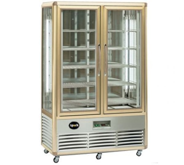 Дана модель має дуже стильний вигляд, а практичність використання дозволить встановити його в будь-якому кафе, ресторані або кондитерському магазині. Модель виготовлена із якісного алюмінію, частково забарвленого у бронзовий колір. Основа обладнана коліщатками для легкості переміщення. З чотирьох сторін скло для кращої оглядовості. Дві дверцята, що забезпечують надійну термоізоляцію і зручність доступу до продукту. У середині шафа обладнана 10-ма квадратними полицями. Габарит кожної – 450х450 мм. Яскраве внутрішнє підсвічування. Динамічна система охолодження забезпечить рівномірний розподіл холоду по всіх полицях.