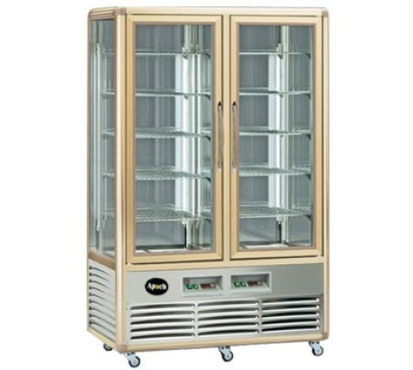 Дана модель має дуже стильний вигляд, а практичність використання дозволить встановити його в будь-якому кафе, ресторані або кондитерському магазині. Модель виготовлена із якісного алюмінію, частково забарвленого у бронзовий колір. Основа обладнана коліщатками для легкості переміщення. З чотирьох сторін склопакети для кращої оглядовості. Дві розділені камери по 350 літрів з дверцятами, що забезпечують надійну термоізоляцію і зручність доступу до продукту. У середині шафа обладнана 10-ма квадратними полицями. Габарит кожної – 450х450 мм. Яскраве внутрішнє підсвічування. Динамічна система охолодження забезпечить рівномірний розподіл холоду по всіх полицях.