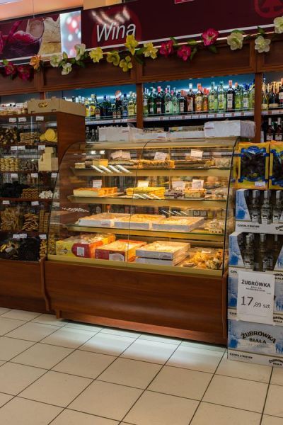 Зовнішній корпус виконаний з дерева, стелажі внутрішньої демонстраційної частини шафи - золотого або срібного кольору, розсувні двері. Для більш успішного привернення уваги покупців є вбудоване світлодіодне підсвічування, нижня фронтальна панель також висвітлюється, тому відвідувачі закладу мають чудову можливість розглянути кондитерські вироби більш уважно.