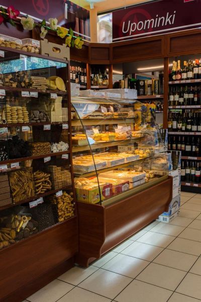 Зовнішній корпус виконаний з дерева, стелажі внутрішньої демонстраційної частини шафи - золотого або срібного кольору, розсувні двері. Для більш успішного привернення уваги покупців є вбудоване світлодіодне підсвічування, нижня фронтальна панель також висвітлюється, тому відвідувачі закладу мають чудову можливість розглянути кондитерські вироби більш уважно.