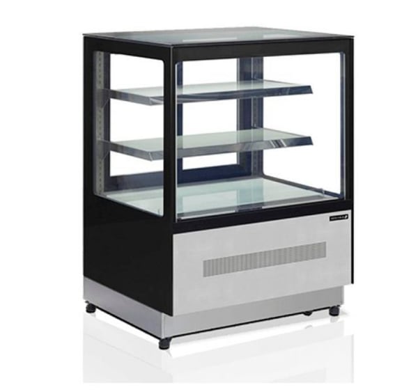 Професійна кондитерська вітрина має 3 міцні хромованих полки, які можуть з легкістю вилучатись для полегшення чищення. і дві розсувні скляні двері.