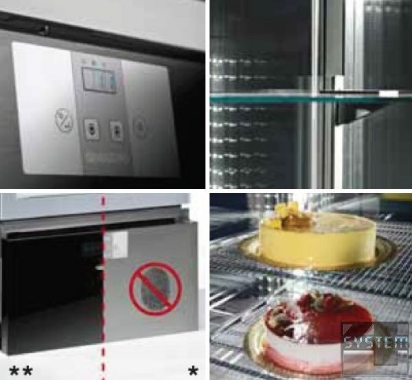 Устройства оборудованы ребристым испарителем с защитой от окисления, герметичным компрессором, медно-алюминиевым конденсатором и цифровой электронной платой. Аппарат имеет съемные полки, за исключением модели Gelateria -25/-15°C, которая имеет фиксированные полки.