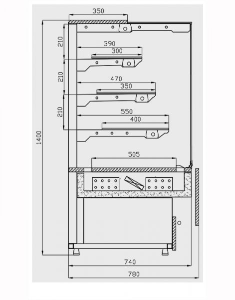 Кондитерська вітрина виготовлена з металу сірого кольору, а для гарного візуального перегляду з усіх боків обладнана прямими склопакетами. Температурний режим вітрини від +5 до +15 С регулюється терморегулятором.