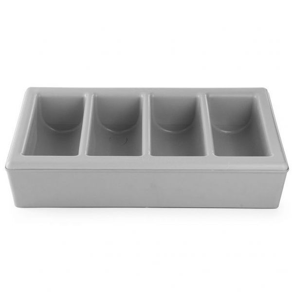 Цей контейнер виконаний з харчового пластику, з підставкою прямокутної форми, на 4 секції, типорозміру GN1/1, глибиною 100 мм. Колір сірий.