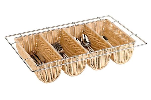 Плетений контейнер на 4 секції виконаний з поліпропілену з обідком з нержавіючої сталі, розмір 530х325х100 мм.