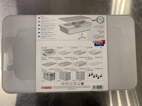 Гастроємність виготовлена з напівпрозорого поліпропілену та стійкого до механічних впливів та теплових перепадів (t°С від -40 до +90). Має гастрономічні розміри GN 1/1, 530/325/100 мм. Підходить як для ручного, так і для машинного миття.