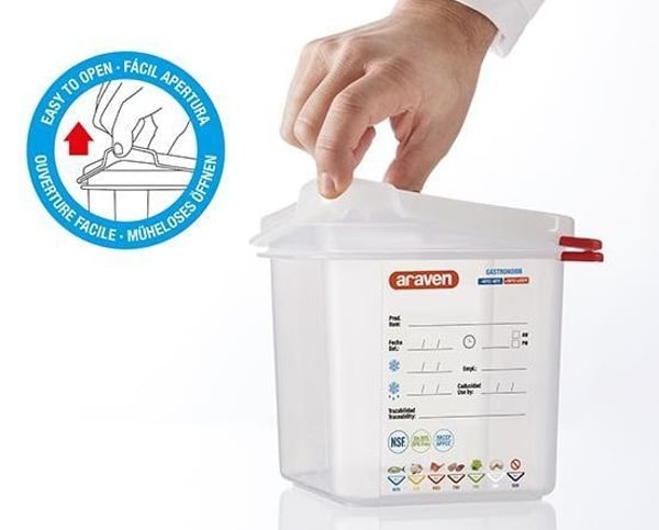 Харчова ємність GN 1/1 Araven також включає кольорові кліпси, за допомогою яких можна керувати харчовими продуктами і на великій вплавленій етикетці гастроконтейнера ставити мітки для відстеження. Це дозволяє фахівцю на професійній кухні ідентифікувати вміст та зберегти інформацію, пов'язану з його походженням.