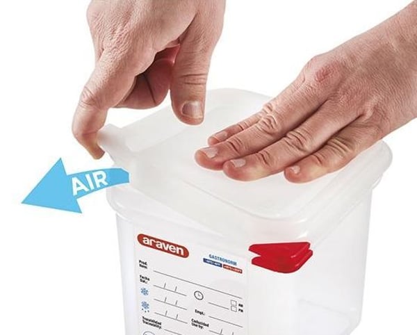 Пластиковий контейнер Аравен має новий дизайн кришки, завдяки подвійній повітронепроникній кромці на кришці, покращується повітронепроникність контейнера, що дозволяє якісніше та довше зберігати їжу. Також на кришці існує канал, який дозволяє витісняти частину повітря всередині контейнера, зменшуючи окиснення їжі та продовжуючи термін її служби до 25%. Кришка гастроконтейнера має спеціальну вкладку для легшого відкриття контейнера.