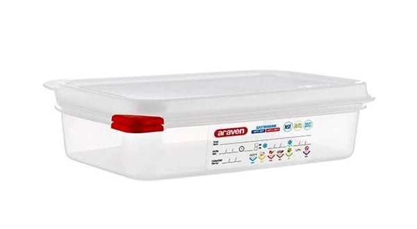 Харчова ємність GN 1/4 Araven також включає кольорові кліпси, за допомогою яких можна керувати харчовими продуктами і на великій вплавленій етикетці гастроконтейнера ставити мітки для відстеження. Це дозволяє фахівцю на професійній кухні ідентифікувати вміст та зберегти інформацію, пов'язану з його походженням.