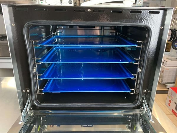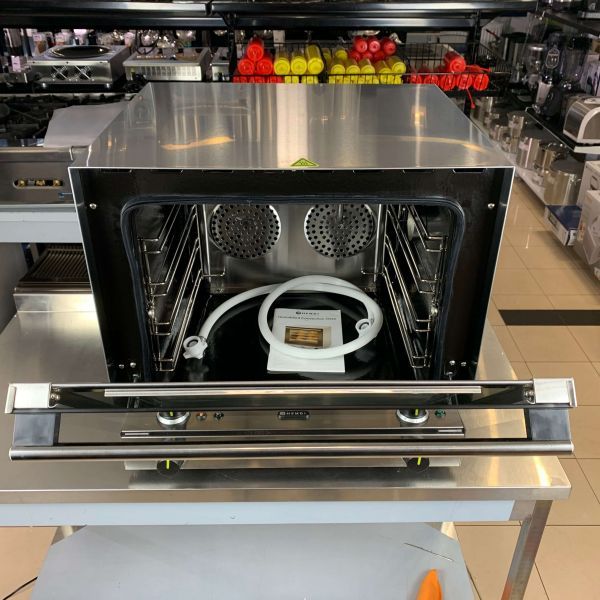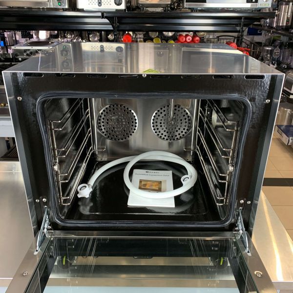 Професійний конвектомат в камері, оснащений напрямними для 4 дек, розміром 438х315х20мм (входять до комплекту).