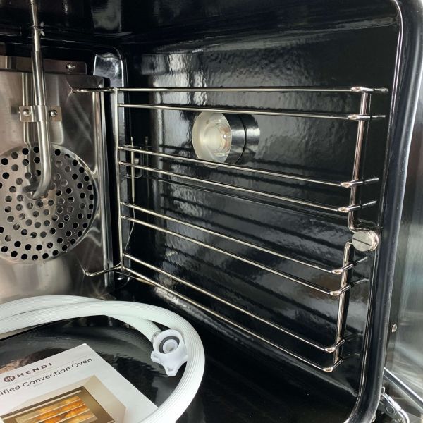 В основу роботи закладено процес конвекції, нагрівання шафи для випікання здійснюється ТЕНами, які нагрівають повітря робочої камери. Далі, гаряче повітря, генерується методом "прямого упорскування", за допомогою перемикача, води на вентилятор. Процес проводиться 2 реверсивними вентиляторами, які рівномірно розподіляють гарячу повітряну масу по всьому об'єму печі - забезпечуючи високий теплообмін між випіканням та навколишнім середовищем в електроконвектоматі Хенді.