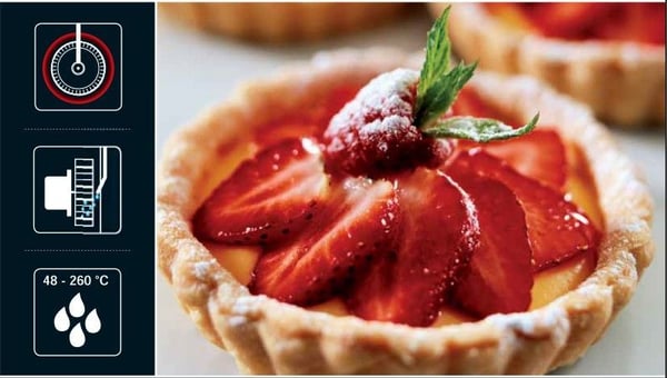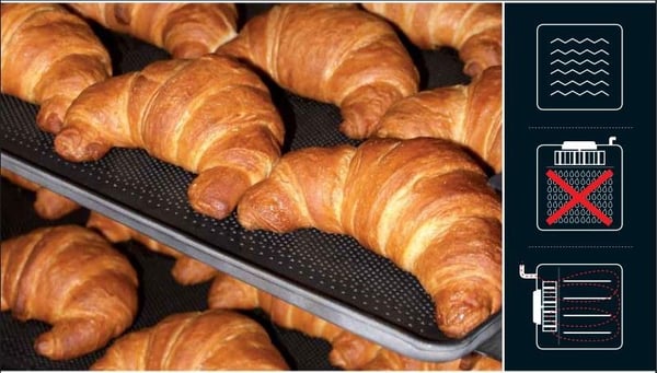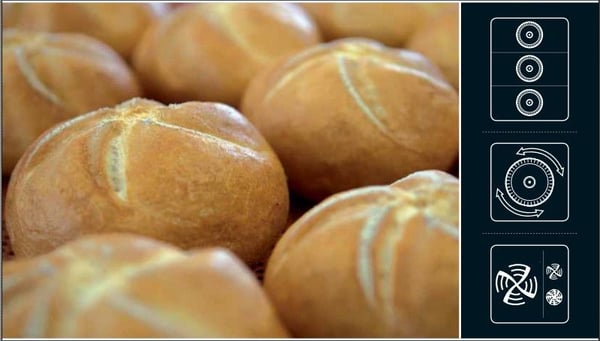 Потоки гарячого повітря завдяки особливим високошвидкісним і потужнішим вентиляторам рівномірно розподіляються в пекарній камері, забезпечуючи рівномірне пропікання продукту на всіх деках, що містяться в печі, і в кожній точці одного дека.