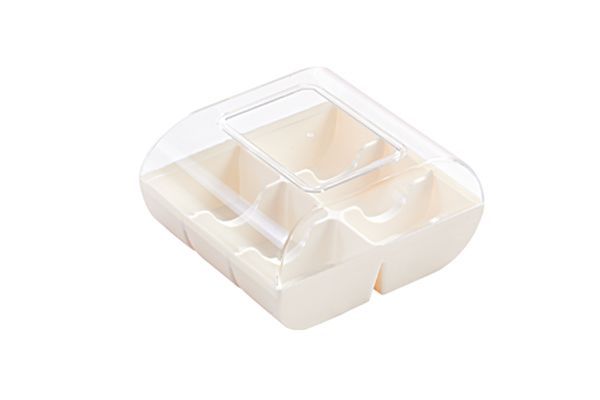 Прозора кришка закривається герметично, завдяки чому макарони надійно захищені від вологості. Крім того, продукти добре проглядаються без необхідності знімати кришку. Структурне дно відокремлює кожну одиницю один від одного, оберігаючи від пошкоджень під час транспортування.