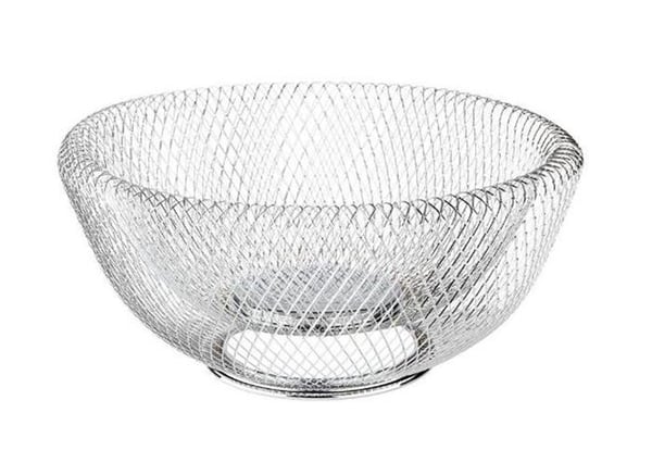 Кошик плетений виконаний з хромованої сталі, має круглу форму.