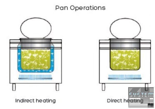 Нагрев непрямого типа с помощью пара под давлением, создаваемого внутри воздушного промежутка двумя независимыми группами горелок (22 + 22 кВт) из нержавеющей стали с оптимизированным сгоранием, с предохранительным клапаном, оснащенным термопарой, и защищенным пилотным огнем.
