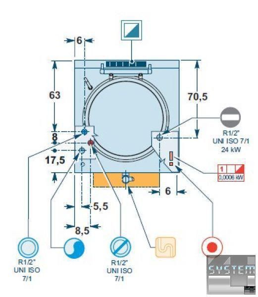 Нагрев непрямого типа с помощью пара под давлением, создаваемого внутри воздушного промежутка двумя независимыми группами горелок (12 + 12 кВт) из нержавеющей стали с оптимизированным сгоранием, с предохранительным клапаном, оснащенным термопарой, и защищенным пилотным огнем.