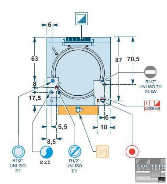Нагрев непрямого типа с помощью пара под давлением, создаваемого внутри воздушного промежутка двумя независимыми группами горелок (12 + 12 кВт) из нержавеющей стали с оптимизированным сгоранием, с предохранительным клапаном, оснащенным термопарой, и защищенным пилотным огнем.