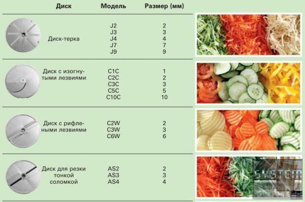 - Широкий вибір ріжучих дисків для овочерізки та роторних ножів для куттера