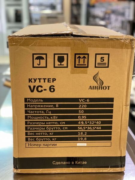 Професійний кутер призначений для подрібнення та змішування різних продуктів на кухнях ресторану, кафе, бару, підприємствах громадського харчування та торгівлі. Кутер AIRHOT VC-6 призначений для приготування соусів, паштетів, фаршів, суфле, кремів шляхом швидкого та тонкого подрібнення продуктів – сухофруктів, горіхів, шоколаду, сухарів, вафель, сиру, м'яса та інших інгредієнтів. Кутер дозволяє навіть замішувати тісто як на пельмені. Також дозволяє рубати м'ясо на дрібно рубану і кнельну масу, подрібнювати цибулю, чорнослив, курагу, кальмари, варене м'ясо, сир, варені яйця.