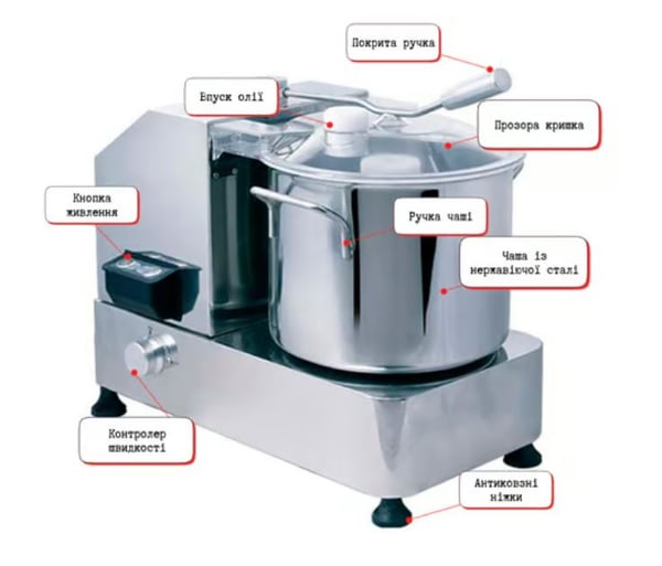 Незважаючи на свої незначні габаритні розміри, дозволяє швидко приготувати величезну кількість страв та напівфабрикатних заготовок. Продукти подрібнюються до стану дрібного кубика, що створює зручність при роботі з фаршуванням. Бокове розташування чаші дозволяє уникнути нагрівання продукту від двигуна.