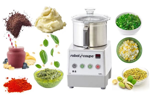 Модель кутера Robot-Coupe R5 - 2V розроблена для подрібнення, приготування тонких фаршів, паштетів, кремів та соусів, збивання вершків, емульсій та мусів, розмелювання та замішування тіста, подрібнення зелені, спецій, суфле шляхом швидкого та тонкого подрібнення продуктів – сухофруктів, горіхів, шоколаду, сухарів, вафель, сиру, м'яса та інших інгредієнтів. Куттер дозволяє навіть замішувати тісто як на пельмені. Також дозволяє рубати м'ясо на дрібно рубану і кнельну масу, подрібнювати цибулю, чорнослив, курагу, кальмари, варене м'ясо, сир, варені яйця.