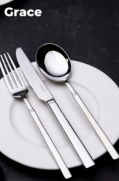 Столові прибори колекції Grace виконані із високоякісної харчової нержавіючої вуглецевої сталі 18/10 (вміст хрому – 18%, нікелю – 10%)