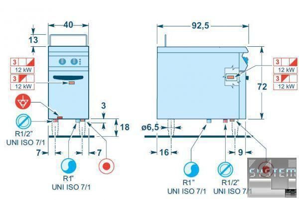 Разогрев прямого типа, создаваемый группой нагревательных элементов из нержавеющей стали, расположенных в ванной, регулируется 5-ти позиционным переключателем - от 2 до 12 кВт.