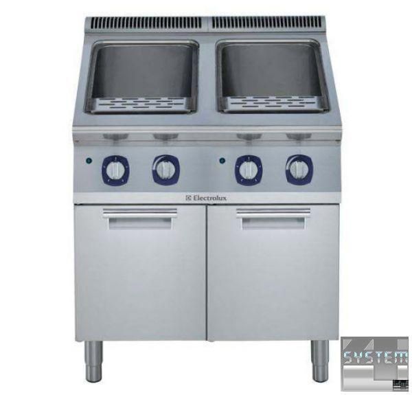 Універсальний варильний апарат Electrolux e9pceh2mf0 має дві ванни об'ємом по 40л, система нагріву з інфрачервоними тенами, система плавного регулювання потужності нагріву EnergyControl, оснащений краном подачі води, виконання на закритій основі. Має підлоговий спосіб розташування, товщина металу робочої поверхні апарату 2 мм. Макароноварка має габаритні розміри: 800мм (довжина), 930мм (глибина), 850мм (висота) та важить 62кг. Пристрій живиться від трифазної мережі з напругою 400В та частотою 50 Гц. Оснащена індикатором роботи та контролю напруги. Робоча поверхня із нержавіючої харчової сталі AISI 304 з поліруванням Scotch Brite .