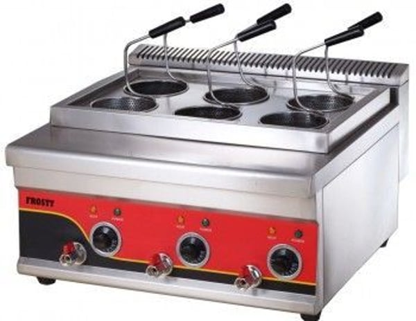 Настільна електрична пастоварка має 3 ванни з кранами для зливу води. У кожну ванну поміщається сітчастий кошик для відварювання, наповнений водою, який має термостійку пластикову ручку.