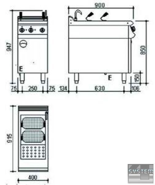 Зроблена із сатинованого хромонікелевого листа 18/8 н/с. Температура регулюється в межах 0-110 ° C за допомогою багаторівневого термостата. Основний перемикач призначений для подачі чи вимкнення енергії. Усі електричні прилади та механізми відповідають міжнародним стандартам. Внизу є кульовий вентиль 3/4" для стоку води з резервуара. Втулка для наповнення води регулюється за допомогою передньої панелі. Пристрій для спуску води з метою запобігання переливанню води в резервуарі. Регульована опора з нержавіючої труби і каркасні листи товщиною 2 мм. нержавіючої сталі.