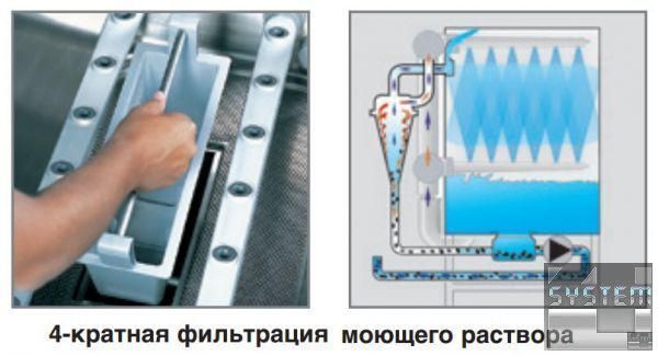 Система сітчастих фільтрів працює захисту внутрішнього простору танка від великих частинок забруднень. Додатковим захистом від забруднень призначений сітчастий фільтр та Mediamat Cyclo. Mediamat Cyclo забезпечує видалення найдрібніших частинок забруднень з миючого розчину. Завдяки 4-кратній системі фільтрації миючий розчин залишається чистим і може застосовуватися протягом усього робочого дня. Що призводить до зниження витрати води, енергії, миючих та ополіскувальних засобів.