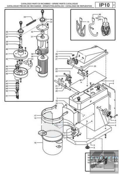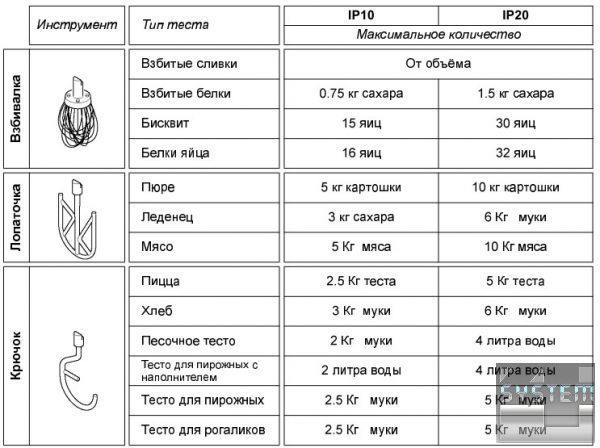 - оснащена знімною дежою, швидкороз'ємним кріпленням робочих органів, 3-швидкісним перемикачем, таймером на 0÷15 хвилин (тільки в моделях IP/60F-IP/80F), захистом двигуна від перевантажень (крім моделі IP/10F), візком для відкочування діжі ( тільки у моделях IP/60F - IP/80F);