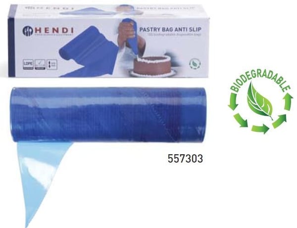 Мішок для крему Hendi 557303 виконаний із поліетилену, якому характерні легкість, еластичність та безпека при контакті з харчовими продуктами. Після використання, що протиковзає кондитерський мішок Хенді, піддається процесу біорозкладання - нешкідливий для навколишнього середовища.