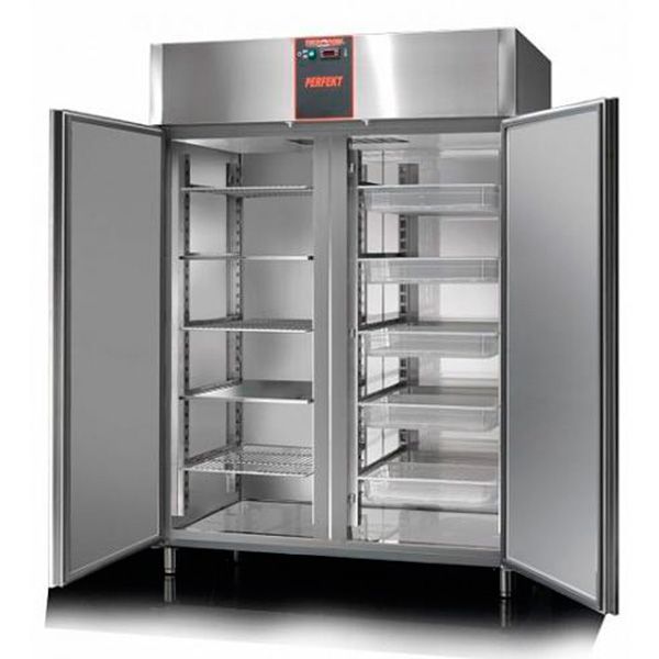 Дві глухі двері з автоматичним пристроєм, що блокує. Робоча температура становить -18 ºC, -22 ºC, об'єм шафи 1400л, 6 полиць із пластиковим покриттям для гастроємностей розміром GN 2/1 ., товщина термоізоляції 60 мм.
