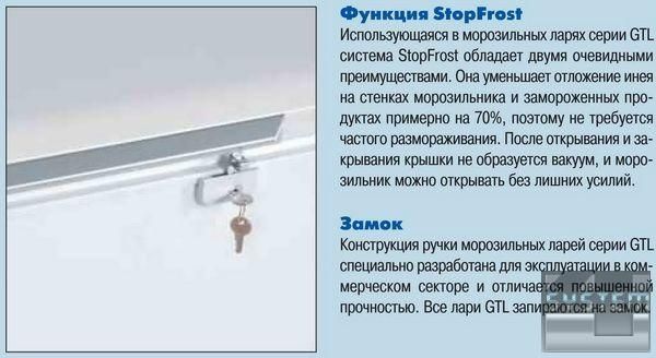 Система StopFrost в GTL-скринях дає дві вирішальні переваги: Утворення інею на стінках морозильної камери і на продуктах знижується на величину до 70%. Таким чином, розморожування потрібно значно рідше. І після відкривання і закривання кришки скрині не виникає розрідження і морозильна скриня можна легко відкрити. Рукоятка GTL-скриньок має посилене виконання для комерційного застосування. Усі прилади надійно закриваються.