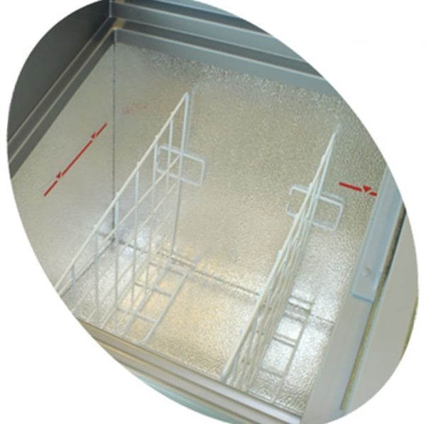 Засклена конструкція кришки камери вигідно надасть викладку товару і цим наочно дозволить визначити місце розташування потрібного продукту, не відчиняючи дверцят - це дозволяє зберегти внутрішній температурний режим морозильної камери Tefcold. Горизонтальна кришка скрині оснащена склом , яке має спеціальне антизапотівне покриття. А на внутрішній стороні скла нанесено металооксид, який перешкоджає проникненню теплових променів усередину робочої камери.