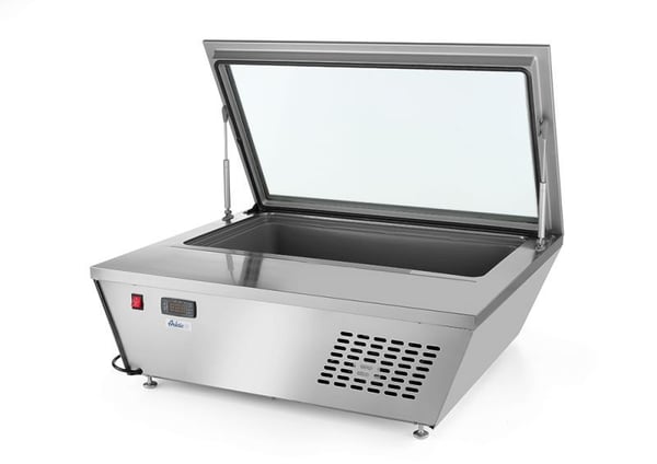 Професійна морозильна вітрина з місткістю 8x GN 1/6 або 4x GN 1/3, виконана з сталі, що нержвіє, кришка з потрійним склом легко відкривається. Ніжки у топінг-вітрини регулюються по висоті.