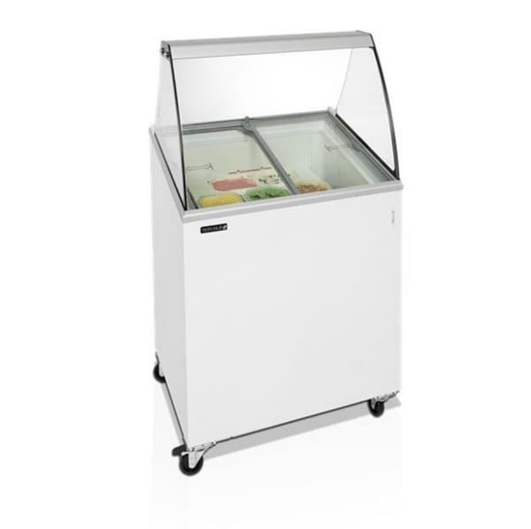Обладнання оснащене скошеним склом та LED підсвічуванням, комплектується платформами із високоякісної нержавіючої харчової сталі, що дозволяє зручно розмістити ємності з ваговим морозивом.