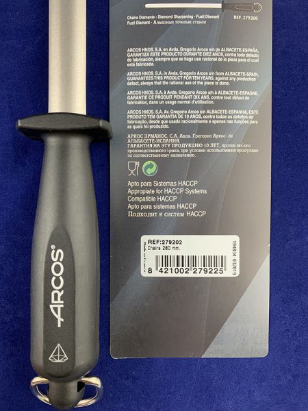 Одна з головних переваг мусату Arcos - це вуглецева сталь з алмазним напиленням і ергономічна рукоять, яка виконана з надміцного пластику. Завдяки наявності кільця на рукояті, його можна підвісити у зручне та помітне місце на кухні, щоб він завжди був під рукою.
