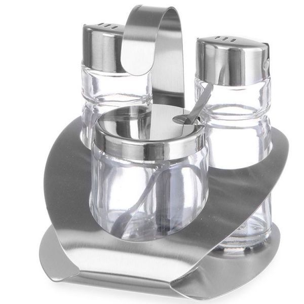 Набір для спецій складається з перечниці, сільнички, ємності для пармезану та підставки. Перечниця, сільничка та ємність виконані зі скла, а підставка та кришечки – нержавіюча сталь.