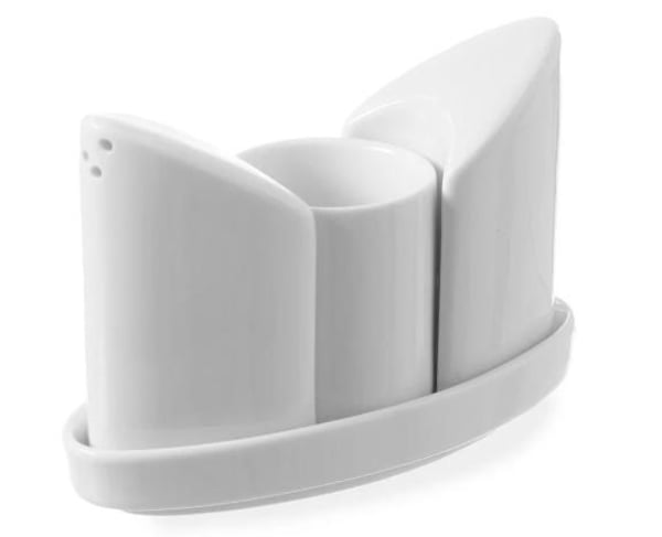 У комплект входить сільничка, перечниця, підставка для зубочисток та блюдце під набір.