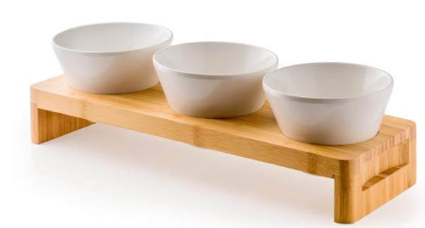 У комплекті, з дерев'яною підставкою, включено 3 меламінові миски. Меламін характеризується високою міцністю та твердістю поверхні.