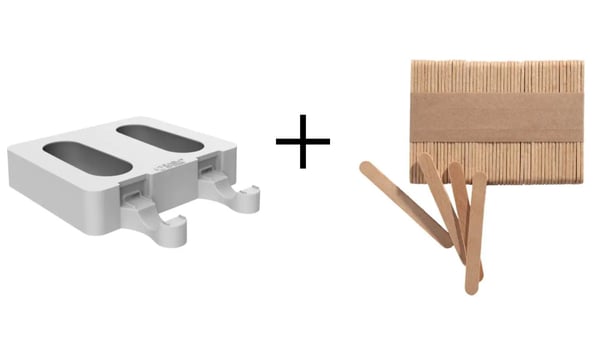Продається в комплекті, який включає 2 формочки (по 76 мл) з двома порожнинами кожна та 50 харчових дерев'яних паличок.