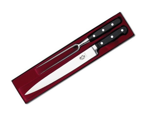 Кухонний набір для нарізування та оброблення – традиційний великий ніж шеф-кухаря та обробна вилка. Зручний при приготуванні, нарізанні та подачі на стіл будь-яких страв з м'яса та птиці. Кухонний ніж 7.7113.25 Вилка обробна 7.7133.18.