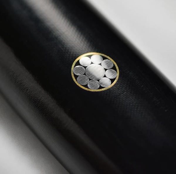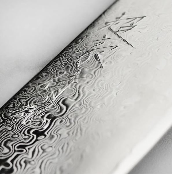 • В основі клинків є високоякісна японська порошкова сталь SG2, покрита захисними обкладками з 190 шарів нержавіючої сталі з ефектним дамаським візерунком на лезі.