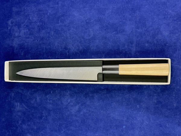 Японський ніж із цієї серії стане справжнім подарунком для поціновувача японських кулінарних традицій. Форма ручки дозволяє працювати невтомно у всіх техніках. На лезі ножа зображено добре вигравіруваний логотип Yaxell. Довжина 210 мм.