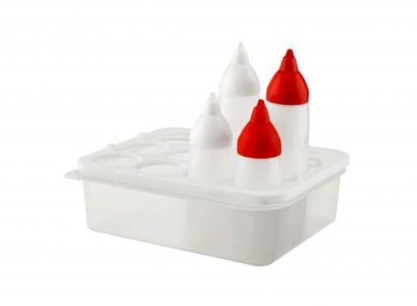 Підставка для диспенсерів відноситься до сегменту професійного кухонного інвентарю для кафе, фаст-фудів та інших закладів громадського харчування. Підставка з отворами виконана з поліетилену та призначена для ємностей із соусами. Підходить для диспенсерів Araven.