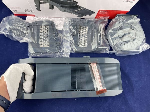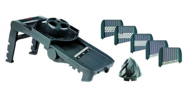 Мандоліна з 5 лезами виконана з високоякісної нержавіючої сталі, можна мити в посудомийній машині, регулювання товщини від 0-12 мм.